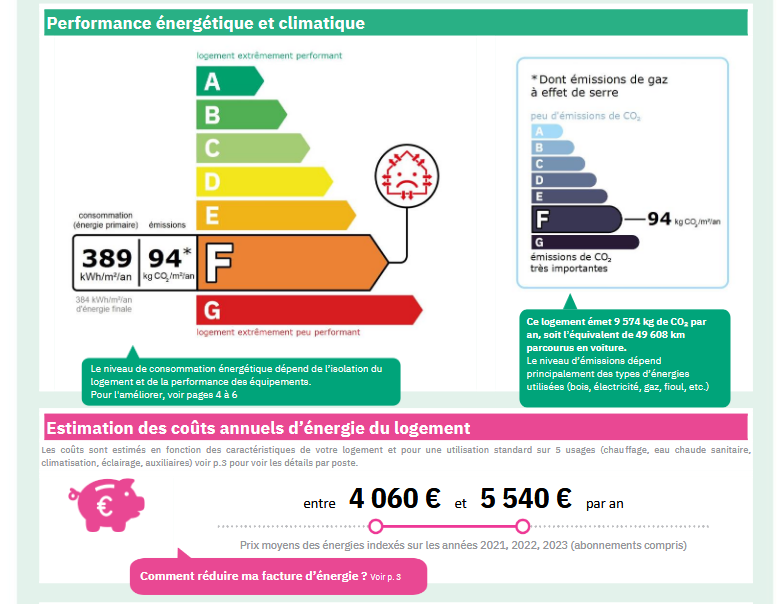 Consommations énergétiques - F - 389 kWh/m²/an.